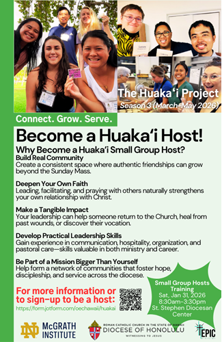 Our next Small Group Leader/Host Training is on January 31, 2026 at St. Stephen Diocesan Center, O'ahu. Want more information? Click the image below: