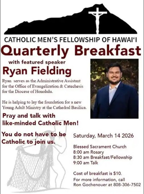 Blessed Sacrament Church, Honolulu Pray and talk with like-minded Catholic Men at the Catholic Men's Fellowship of Hawaii's quarterly breakfast. This month will feature speaker Ryan Fielding.