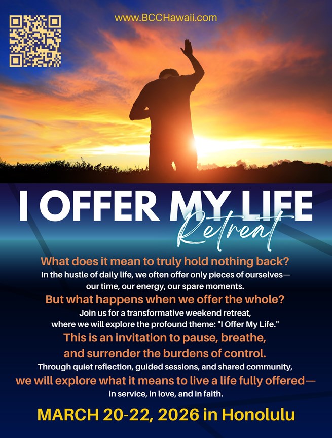 What does it mean to truly hold nothing back? In the hustle of daily life, we often offer only pieces of ourselves—our time, our energy, our spare moments. But what happens when we offer the whole? Join us for a transformative weekend retreat, where we will explore the profound theme: "I Offer My Life." This is an invitation to pause, breathe, and surrender the burdens of control. Through quiet reflection, guided sessions, and shared community, we will explore what it means to live a life fully offered—in service, in love, and in faith.